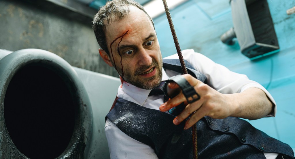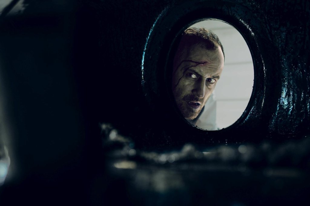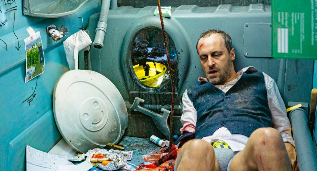 Das knallbunte Cover, die überdrehte Anfangsszene und der quietschbunte Look schreien förmlich nach einem abgefahrenen Ritt im Stile des Jason Statham Actioners „Crank“ oder der nicht minder verrückten Netflix-Serie „Happy“, zu dessen Hauptdarsteller der deutsche Schauspieler Thomas Niehaus lustigerweise auch noch optische Parallelen aufweist. Doch Fehlanzeige! „Ach du Scheiße!“ ist zwar immer wieder völlig drüber, entpuppt sich aber schon nach dem Opener als ein auf wenige Quadratmeter beschränkte Survival-Kammerspiel a la „Buried“. Anders als einst Ryan Reynolds findet sich der Protagonist jedoch nicht in einem Holzsarg mehrere Meter unter der Erde, sondern in einem umgestürzten Dixie-Klo in einer Baugrube wieder – und das zu knapp 90 Prozent der gesamten Spielzeit.
