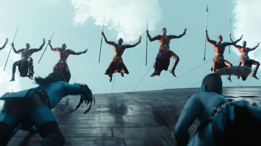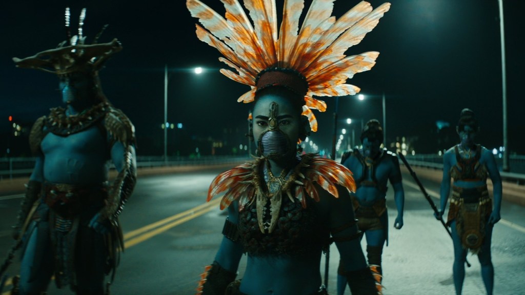 Clash of Cultures – doch wo ist die Kultur? Während der erste Teil noch ein feines Gespür zeigte, wie man sein Publikum in die fremde Welt von Wakanda einzuführen, fehlt der Fortsetzung von diesem Ideenreichtum jede Spur. Nicht nur, dass Wakanda kaum eine Rolle mehr spielt und zum x-beliebigen Fleckchen Erde verkommt, bekommen die Zuschauer*innen kein Gefühl für das neu eingeführte, von Antagonist Namor beherrschte Land in den Tiefen des Ozeans. Die wenigen Einblicke, die „Black Panther: Wakanda Forever“ in die Unterwasserwelt bietet, fallen ähnlich unspektakulär und nichtssagend aus wie der gesamte Film. Ohne Chadwick Boseman als Sympathieträger müssen es eben die andere Darsteller*innen richten. Nur leider eignet sich keiner der Figuren als neuer Dreh- und Angelpunkt der Geschichte. Während Shuri in „Black Panther“ als Sidekick die eine oder anderen Szene noch an sich riss und viele der erneut in Erscheinung tretenden Nebenfiguren in ihren kurzen Momenten überzeugen, leidet „Black Panther: Wakanda Forever“ doch schwer darunter ohne eine richtige Hauptfigur auskommen zu müssen.