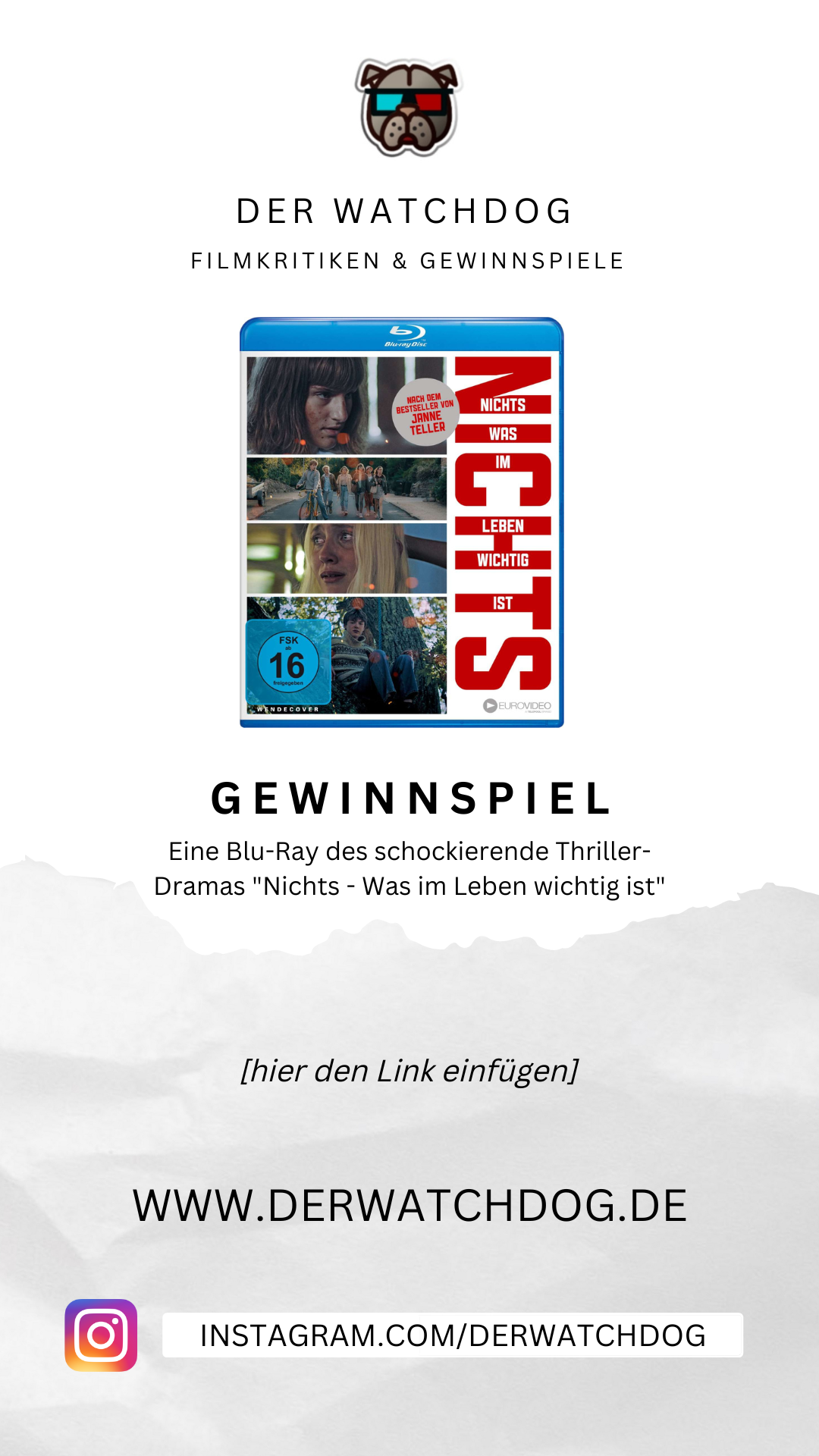 Zu gewinnen gibt es eine Blu-Ray des dänischen Thriller-Dramas „Nichts – Was im Leben wichtig ist“. Aus allen Teilnehmer*innen wird eine Gewinner*in ausgelost, die nach dem Gewinnspiel per E-Mail kontaktiert werden.