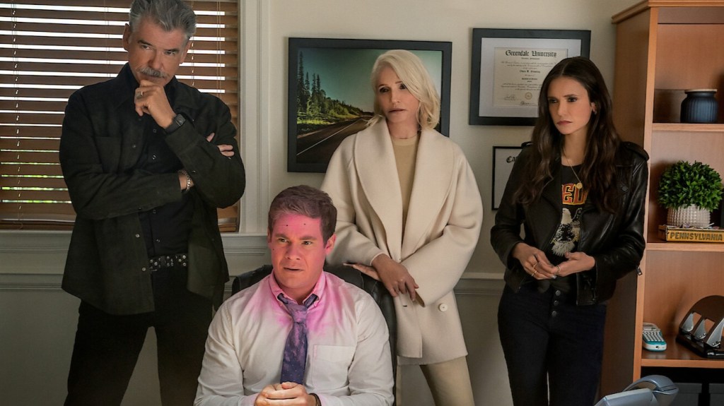 Wer sich einmal mit dem filmischen Schaffen von „Workaholics“-Darsteller Adam DeVine auseinandergesetzt, und das Gesehene als albernen Klamauk abgestraft hat, kann an dieser Stelle eigentlich direkt kehrt machen und die Actionkomödie „The Out-Laws“ wieder aus der Netflix-Watchlist entfernen. Der völlig überdrehte Anarcho-Humor, von welchem bereits seine Comedy-Central-Sitcom „Workaholics“ lebe, bildet auch das Herzstück dieses prominent besetzten Netflix Originals. So darf sich DeVine an der Seite von „Vampire Diaries“-Star Nina Dobrev, vor allem aber im Zusammenspiel mit zwei Hollywood-Legenden, die humoristisch-derben Bälle zuspielen: Ex-Bond-Darsteller Pierce Brosnan und „American Diner“-Schönheit Ellen Barkin – und die beiden haben sichtlich Spaß mit dem Non-sense!
