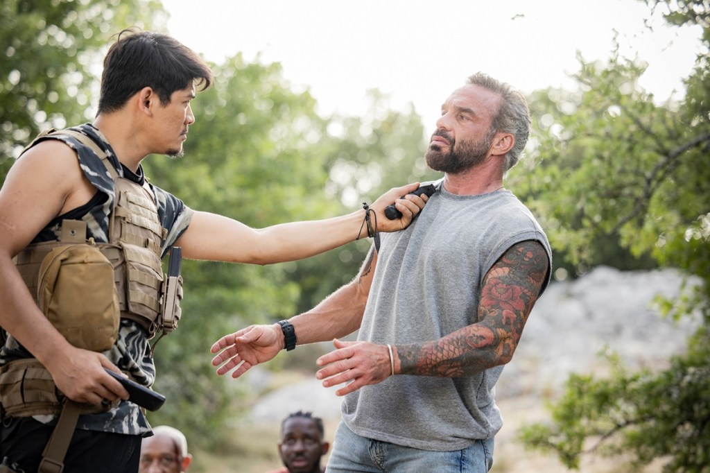 Man bekommt Paul Vilar zwar aus der Wildnis, aber die Wildnis niemals aus Paul Vilar! Und wenn er dann doch einmal in die Zivilisation einkehrt, lässt sich schnell ein Grund finden, den kernigen Haudegen schnellstmöglich zurück in die Natur zu verfrachten – und sei es nur für ein ausgiebiges Workout mit Baumstämmen, Felsbrocken und sonstigen Fitnessgerätschaften, die ihm Mutter Natur zu Füßen legt. Zurück im Betondschungel drehen sich die Frauen natürlich reihenweise nach ihm um, und selbst die Kamera hält für einen Moment inne und wechselt ehrfürchtig in den Zeitraffer, um die Männlichkeit auf zwei Beinen in seiner vollen Pracht auszukosten, wenn Vilar per Drehkick böse Jungs durch die Prärie prügelt. Dieser völlig überzogene Macho-Quatsch mag mit einer Action-Legende wie Arnold Schwarzenegger oder Sylvester Stallone im Rahmen einer aufwendigen Hollywood-Produktion vielleicht noch funktionieren, im Falle von „On the Edge 2: Pfad der Wölfe“ fehlt es dafür jedoch sowohl an einer echten Heldenfigur als auch am nötigen Kleingeld!
